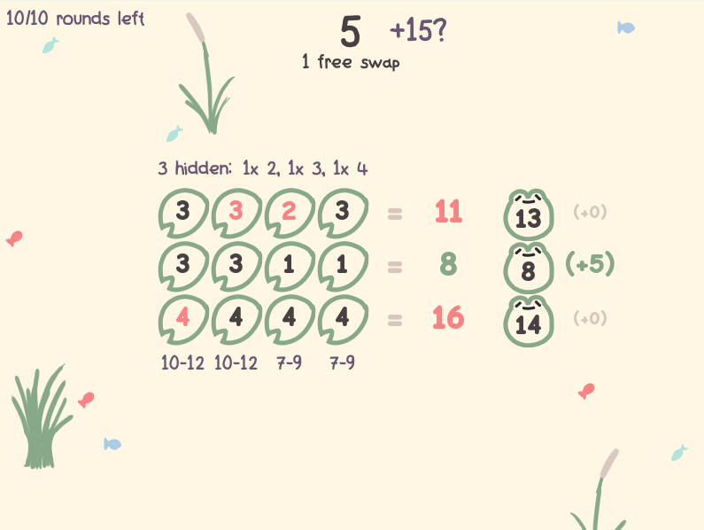 Swap lilypads and frogs until they sum to the number on the right. Try to get 100 points within 10 rounds!